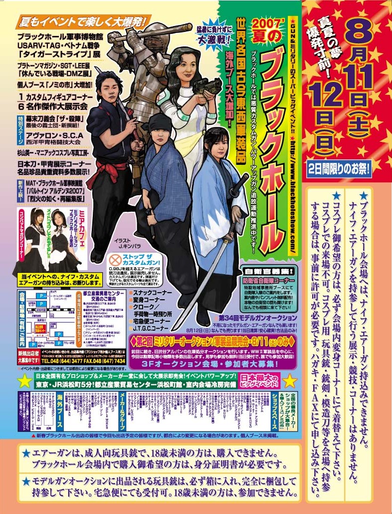 モデルガン(エアーガン)の為のお祭りなのですが、もしご興味がある方は是非ともご来場下さい! 特に、今回は勝ち取りシューティング(エアガンのシューティングレンジにて的に当てると・・)にて 多数の景品が主催の日本遊技銃協同組合の加盟企業から出ています! 日時:2007年11月10日(土) 場所:東京都立産業貿易センター 浅草・台東館 4F 入場料:800円 時間:夕方5時まで開催! 詳細はこちら ASGK - フェスティバル http://www.asgk.jp/fest/2007.html |