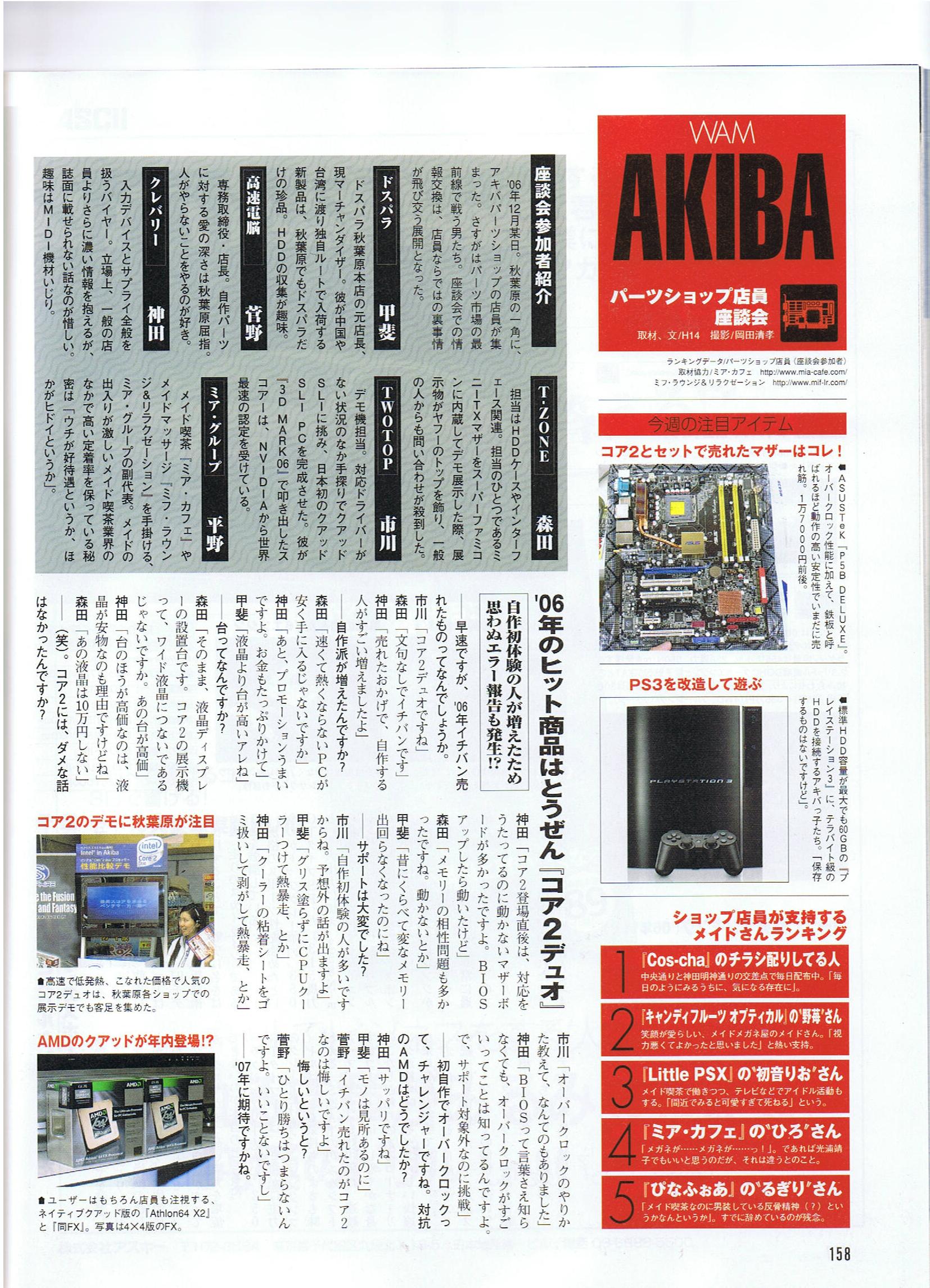 週刊アスキー 2007年1月23日号 掲載ページ:158,159P 掲載内容:AKIBAパーツショップ店員座談会 掲載スタッフ:(ミアカフェ)ひろ・かれん(ミア・リラクゼーション)苺 ページ詳細 http://maidhouse.main.jp/kouhou/aski2007-1-23-1 http://maidhouse.main.jp/kouhou/aski2007-1-23-2 |