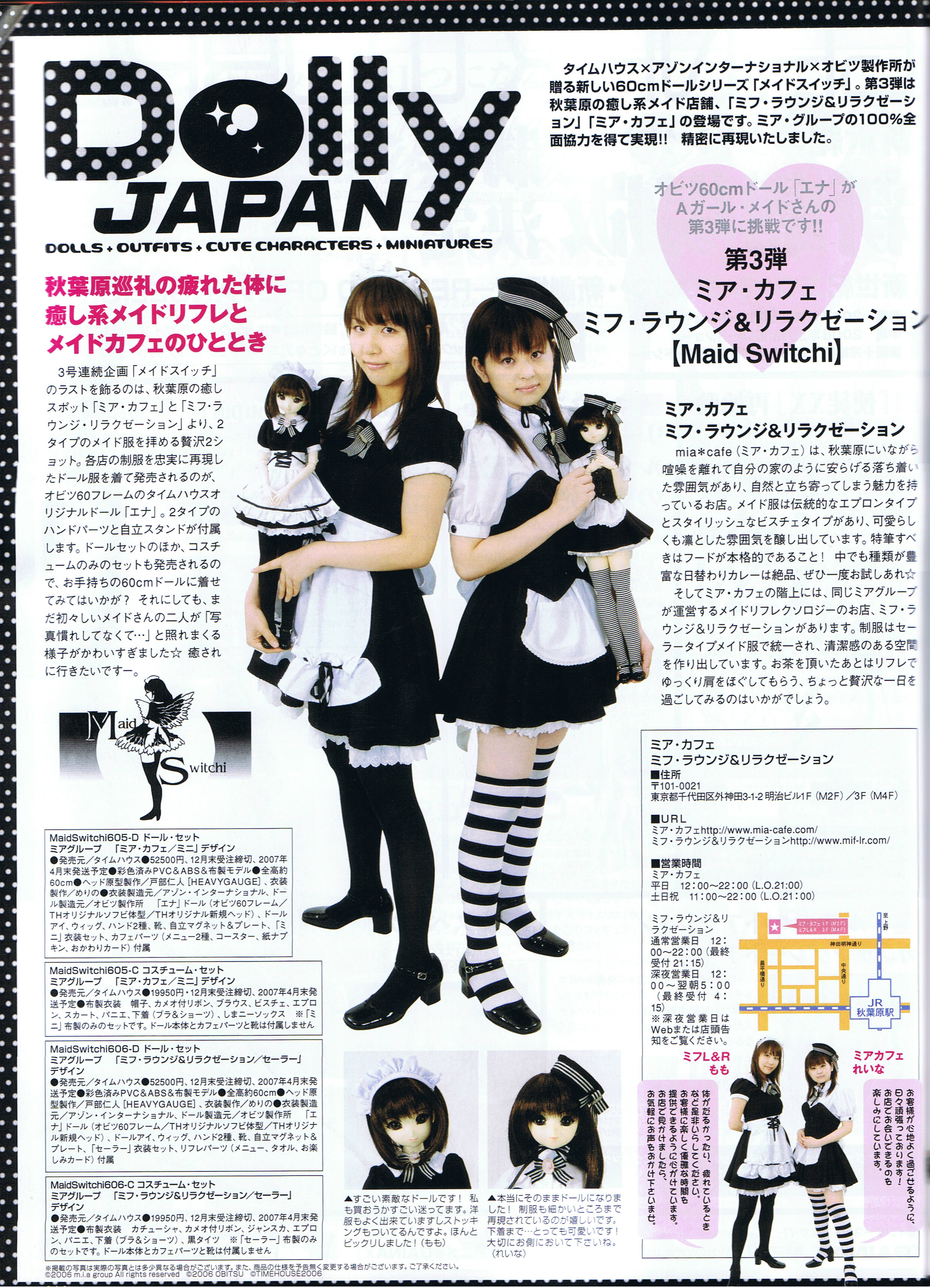 月刊ホビージャパン 2006 11月号 掲載ページ:214P 掲載内容:ミアカフェ・ミアコスチューム 掲載スタッフ:(ミフ・ラウンジ)もも(ミアカフェ)もえ ページ詳細 http://maidhouse.main.jp/kouhou/hobby11 |