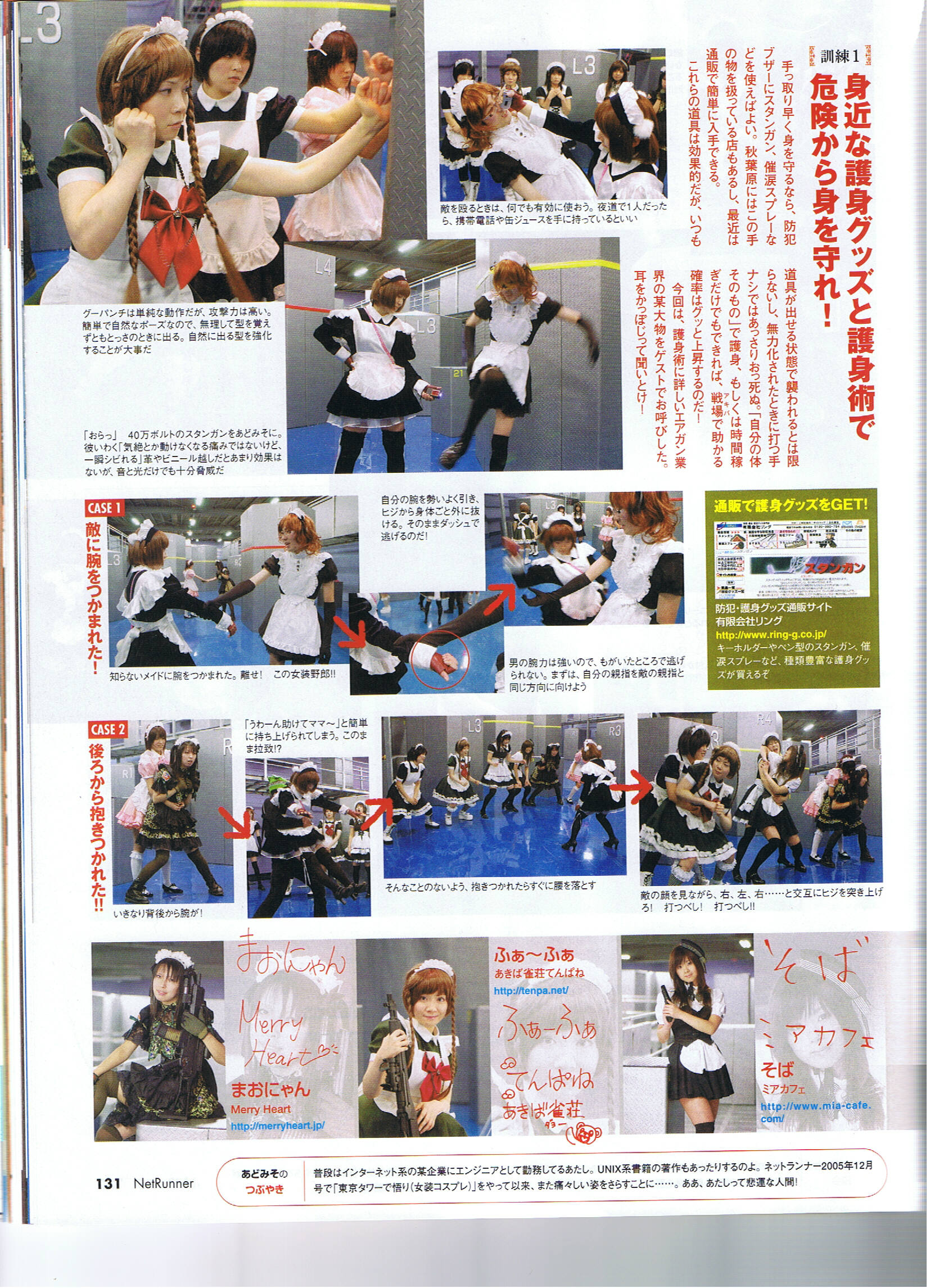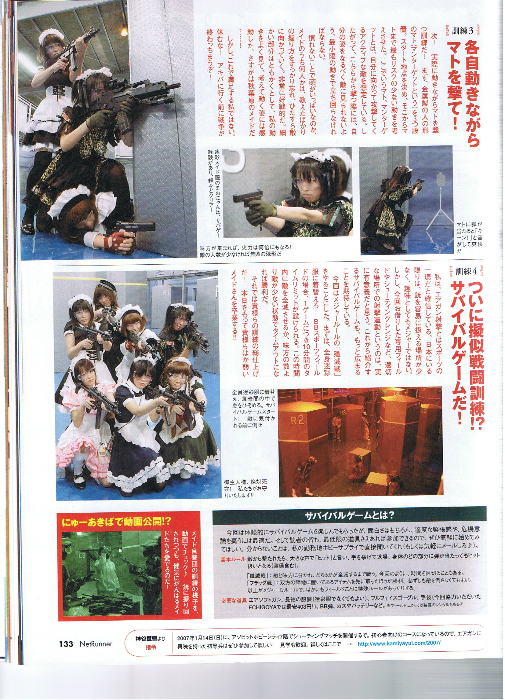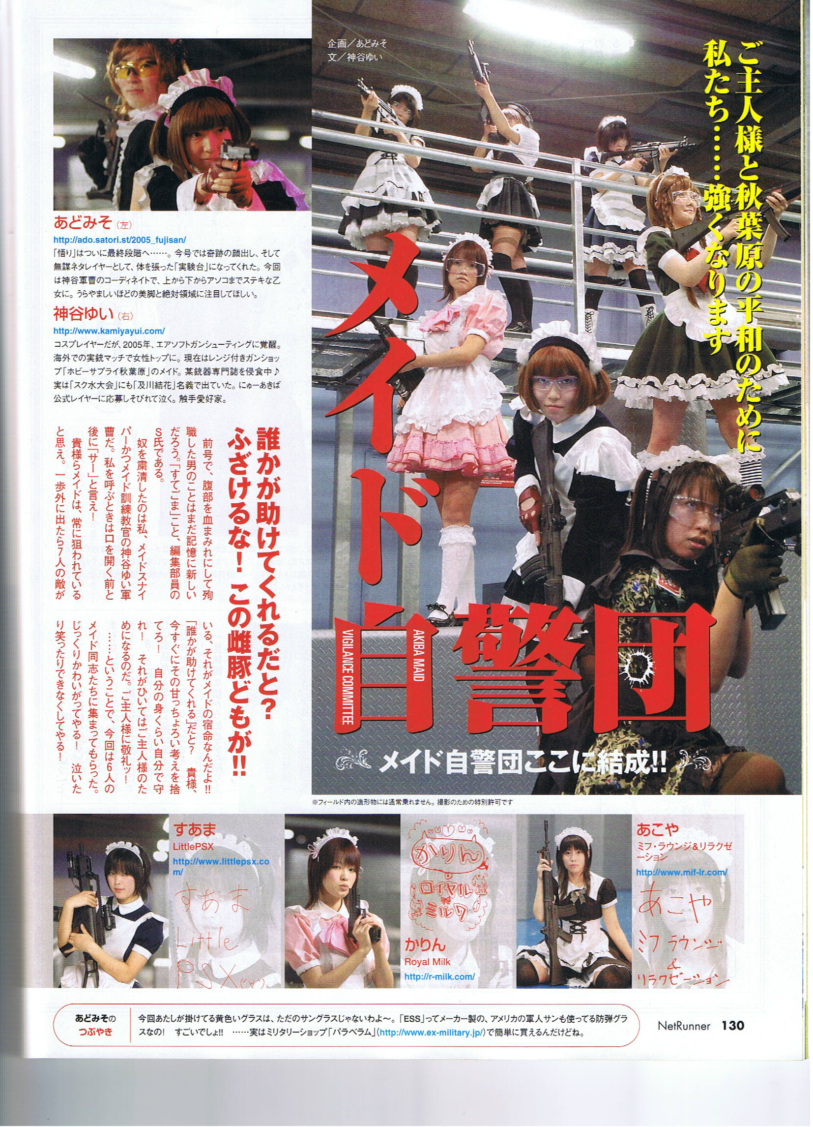 月刊ネットランナー2007年2月号 掲載ページ:130〜133P 掲載内容:メイド自警団結成 サバイバルゲーム体験 掲載スタッフ:(ミアカフェ)そば ページ詳細 http://maidhouse.main.jp/kouhou/netrunner-2007-2-1 http://maidhouse.main.jp/kouhou/netrunner-2007-2-2 http://maidhouse.main.jp/kouhou/netrunner-2007-2-3 http://maidhouse.main.jp/kouhou/netrunner-2007-2-4 |