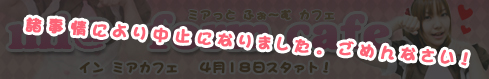 | ■各店舗の営業日およびメイドさんのシフト状況を確認したいお客様へ■ ■各店舗のスケジュールをクリックください!■ ▲▲ミアカフェ秋葉原店・ミアリラ&フォト東京店 → シフト状況はhttps://x.com/mia_groupにて確認いただけます。 ■■ミアカフェ&フォト山梨店 → シフト状況はhttps://x.com/miakofucityにて確認いただけます。 ◆◆ミアカフェ静岡北口2号店・◆ミアリラ&フォト静岡北口店 → シフト状況はhttps://x.com/shizuokamaidsanにて確認いただけます。 ▼▼ミアカフェ+ミアリラ&フォト浜松店 → シフト状況はhttps://x.com/mia053maidcafeにて確認いただけます。 ■各店舗の営業開始1時間以内に必ずX(旧ツイッター)にて1回以上ポスト・ツイートしています。■ |