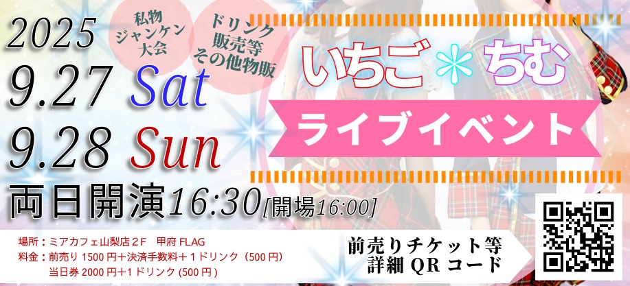 16:00〜18:00 | いちご・ちむのカバー曲ライブ!2days!in甲府FLAG(ミアカフェ山梨店の2階ライブハウス)  | |